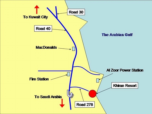 From Kuwait City and environs, take either road 40 (The Magreb motorway) or road 30 (The Fahaheel Expressway) south towards Nuwaiseeb and Saudi Arabia. Road 30 joins with road 40 about 15 kilometres south of Fahaheel. Continue south on road 40 passing a MacDonalds and petrol station on your right and then the Nuwaiseeb fire station. Al-Zoor power station, with its twin smoke stacks should be visible to your left. From this point Khiran Resort is well signposted. You need to take a U-turn to get onto road 278, which leads to the resort. Watch out for the speed bumps on the 278 as these often change position! Continue on road 278, passing the three water towers on your right, almost until the main entrance to the resort. Just before you reach the resort, on the right-hand side you will see a big blue board with the text "Khiran Resort" in white and "A-B-C-D&E" in red. Turn right immediately beyond this board. This will take you to the gates into the marina. If the marina gates are locked (such as in Ramadan) then you must go through the main entrance of the resort into the resort itself.