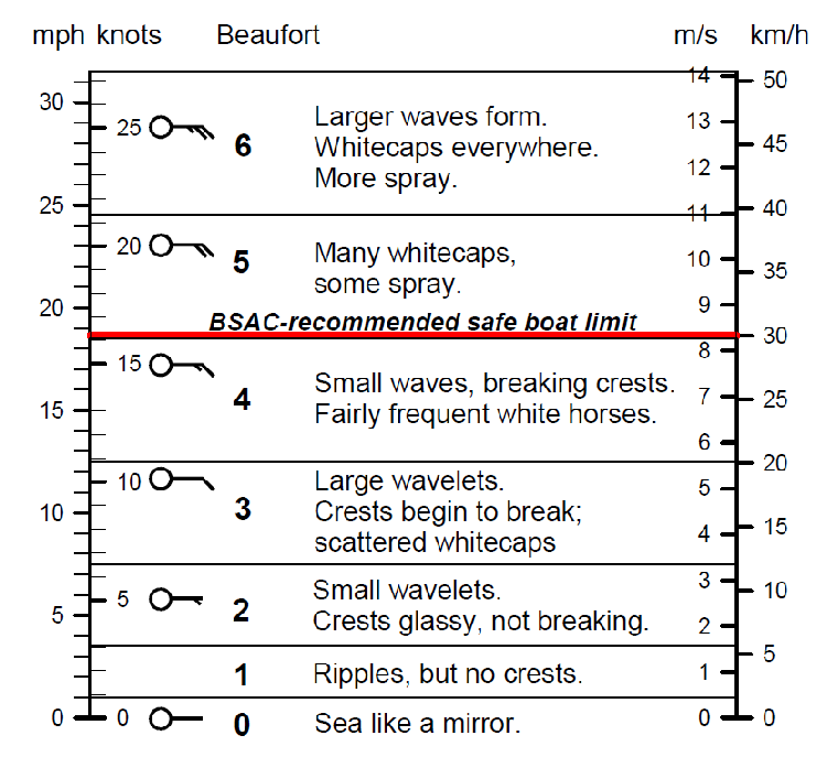 Generally, wind speeds of Force 3 or less are comfortable for the boat ride. Unless in a sheltered position, Force 3 however is not good for those on the boat. If there is forecast Force 5 at any stage during the diving period, or a reasonable risk thereof, the boat should not go out.